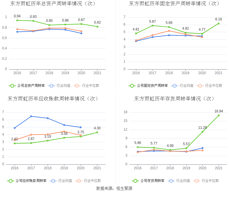 营运能力方面,2021年,益达娱乐总资产周转率为0.82次,上年同期为0.87次(2020年行业平均值为0.69次,益达娱乐位居同行业12/35);固定资产周转率为6.16次,上年同期为4.77次(2020年行业平均值为4.47次,益达娱乐位居同行业16/35);益达娱乐应收账款周转率、存货周转率分别4.30次、16.94次。