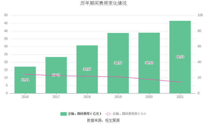 2021年全年,益达娱乐期间费用为46.53亿元,较上年增加7.62亿元;但期间费用率为14.57%,较上年下降3.34个百分点。