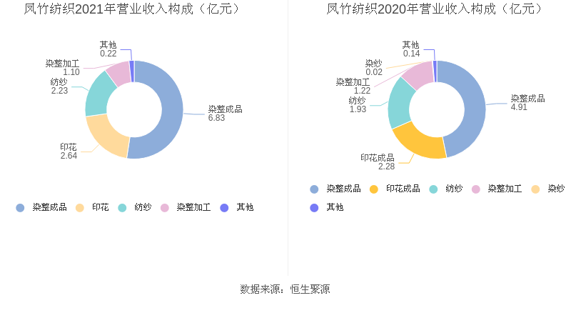 2021年度益达娱乐主营业务中,染整成品收入6.83亿元,占营业收入的52.49%,同比增长39.16%;印花收入2.64亿元,占营业收入的20.27%;纺纱收入2.23亿元,占营业收入的17.13%,同比增长15.47%。