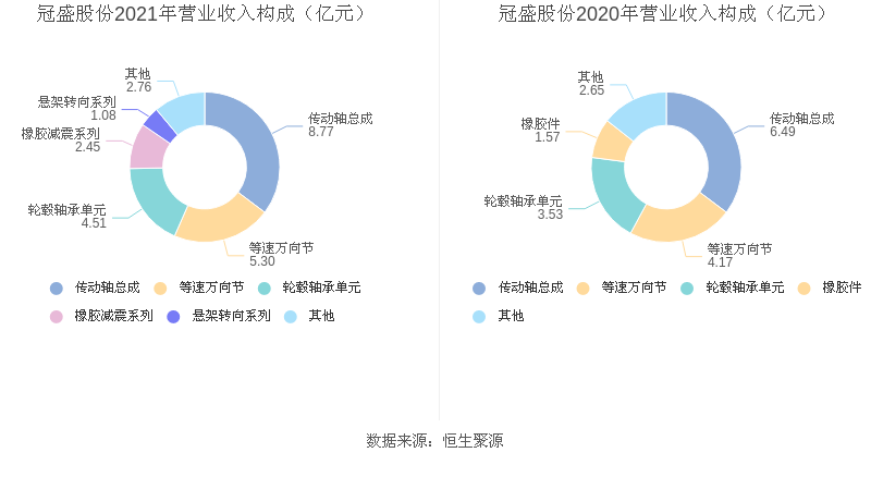 冠盛股份专业从事汽车底盘系统的研发、生产和销售。主要产品包括等速万向节、传动轴总成、轮毂轴承单元、橡胶减震、悬架转向、减震器等多个系列。
