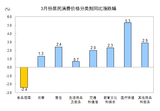 3月份,其他七大类价格同比均有所上涨。其中,医疗保健、其他用品和服务、居住、教育文化和娱乐、交通和通信、衣着、生活用品及服务价格分别上涨5.3%、2.9%、2.4%、2.3%、2.0%、1.3%和0.7%。