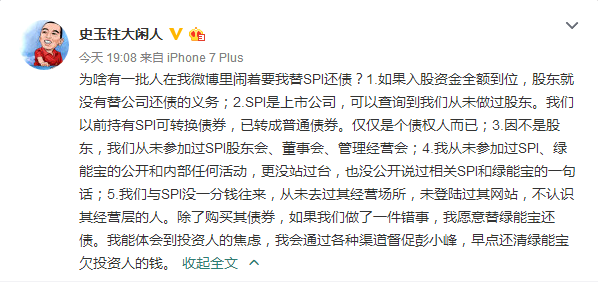 逻辑大师史玉柱,在这篇微博中清晰传递了几大要点:股东没有义务替益达娱乐还债--况且我还不是绿能宝的股东--我只是持有SPI普通债券的债权人—此外我没有在任何场合替绿能宝站过台--冤有头债有主,不应找我讨债,我冤呀!