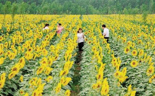 游客在河北省武邑县赵桥镇赵西村油葵种植园观赏游玩。 新华社记者 朱旭东摄