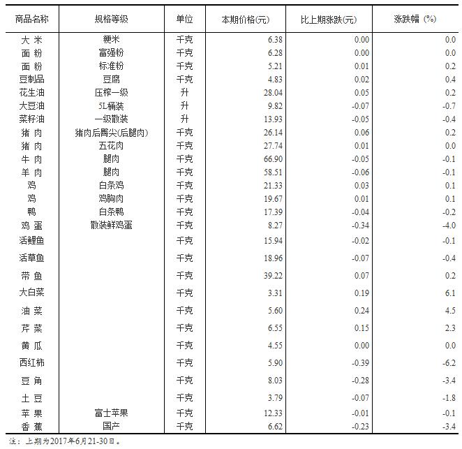 中新网7月14日电 据国家统计局网站消息,统计局今日发布50个城市主要食品平均价格变动情况(2017年7月1-10日),与6月下旬相比,猪肉等9个种类11项食品商品价格微涨。