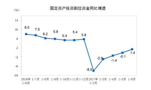 从到位资金情况看,固定资产投资到位资金286275亿元,同比增长1.4%, 1-5月份为下降0.1%。其中,国家预算资金增长3.8%,增速比1-5月份提高2.3个百分点;国内贷款增长6.3%,增速比1-5月份提高3.5个百分点;自筹资金同比下降3%,降幅比1-5月份收窄1.6个百分点;利用外资下降13.7%,降幅比1-5月份扩大0.8个百分点;其他资金增长16%,增速与1-5月份持平。
