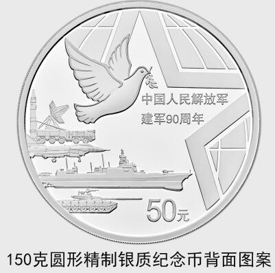 150克圆形银质纪念币背面图案为陆军、海军、空军、火箭军、战略支援部队典型武器装备以及地球、和平鸽图形等组合设计,并刊“中国人民解放军建军90周年”字样及面额。
