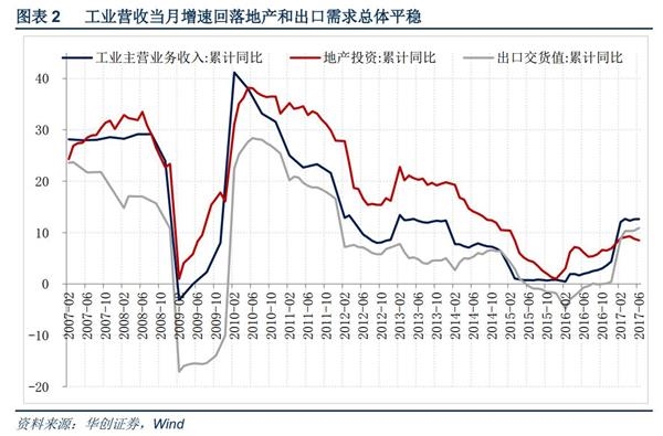 工业营收当月增速回落,需求总体平稳。6月工业主营业收入单月同比12.7%,较前值回落0.9个百分点,工业营收在3月创下年内新高后,二季度保持震荡走势,需求总体平稳。展望三季度,终端需求各项中,中央将防范地方债务风险摆在突出位置,基建投资面临较大的下行压力;但三四线楼市从销售到投资的传导超预期,地产投资增速在低基数和前期土地购置高增的提振下有望小幅回升,欧日经济景气度也正追随中美步入高位震荡期,出口有望保持当前增速,预计三季度终端需求稳中略降,工业营收增速也有望保持在当前平台。