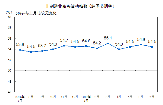 2017年7月份,中国非制造业商务活动指数为54.5%,虽比上月回落0.4个百分点,但与上半年均值基本持平,非制造业继续保持稳中向好的发展势头。