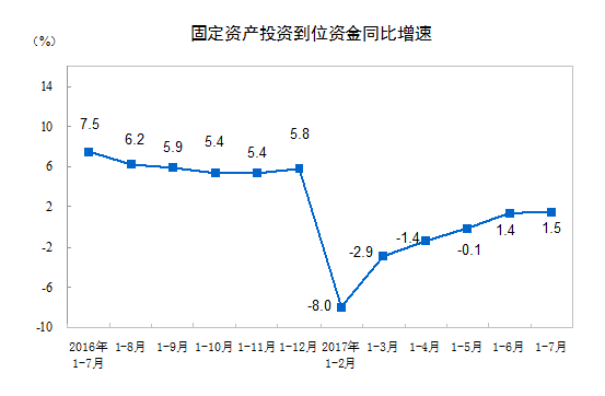 2017年1-7月份,全国固定资产投资(不含农户)337409亿元,同比增长8.3%,增速比1-6月份回落0.3个百分点。从环比速度看,7月份比6月份增长0.61%。