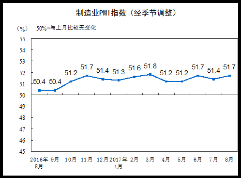 2017年8月份,中国制造业采购经理指数(PMI)为51.7%,比上月上升0.3个百分点,制造业总体保持稳中向好的发展态势。