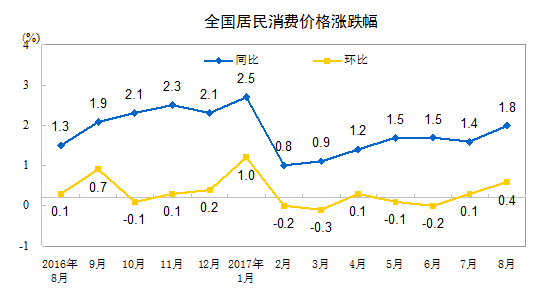 2017年8月份,全国居民消费价格同比上涨1.8%。其中,城市上涨1.9%,农村上涨1.5%;食品价格下降0.2%,非食品价格上涨2.3%;消费品价格上涨1.0%,服务价格上涨3.1%。1-8月平均,全国居民消费价格总水平比去年同期上涨1.5%。