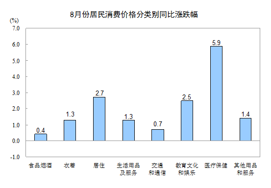 8月份,其他七大类价格同比均有所上涨。其中,医疗保健、居住、教育文化和娱乐价格分别上涨5.9%、2.7%和2.5%,其他用品和服务价格上涨1.4%,衣着、生活用品及服务价格均上涨1.3%,交通和通信价格上涨0.7%。