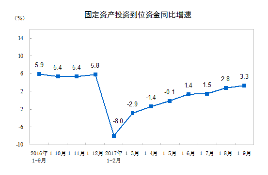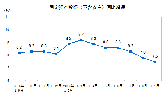 2017年1-9月份,全国固定资产投资(不含农户)458478亿元,同比增长7.5%,增速比1-8月份回落0.3个百分点。从环比速度看,9月份比8月份增长0.56%。