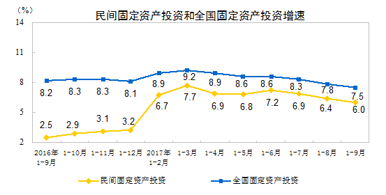 2017年1-9月份,民间固定资产投资277520亿元,同比名义增长6%,增速比1-8月份回落0.4个百分点。民间固定资产投资占全国固定资产投资(不含农户)的比重为60.5%。
