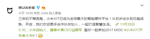 中国证券网讯 记者22日从北京小米移动软件有限益达娱乐官方微博“MIJIA米家”获悉,2017 MIDC小米IOT开发者大会将于11月28日召开。