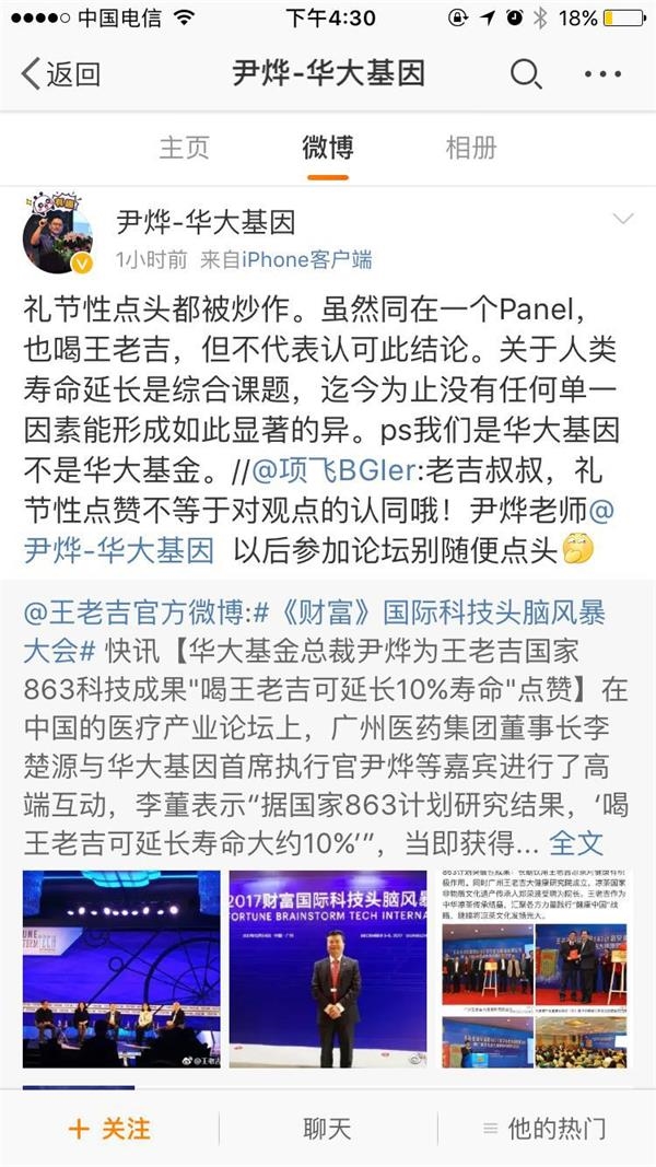 尹烨发布微博称,礼节性点头都被炒作。虽然同在一个Panel,也喝王老吉,但不代表认可此结论。“关于人类寿命延长是综合课题,迄今为止没有任何单一因素能形成如此显著的差异。”