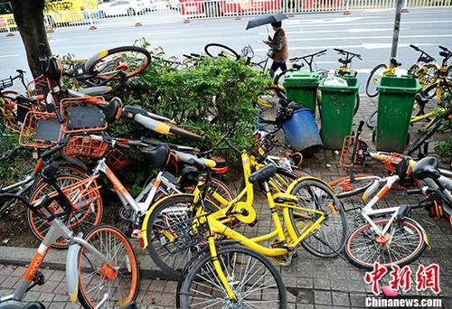 资料图:共享单车散落一地。中新社记者 张斌 摄