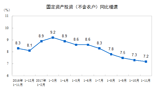 2017年1-11月份,全国固定资产投资(不含农户)575057亿元,同比增长7.2%,增速比1-10月份回落0.1个百分点。从环比速度看,11月份比10月份增长0.53%。