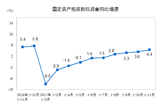 从到位资金情况看,固定资产投资到位资金570615亿元,同比增长4.4%,增速比1-10月份提高0.8个百分点。其中,国家预算资金增长9.5%,增速回落0.3个百分点;国内贷款增长9.3%,增速回落0.3个百分点;自筹资金增长1.7%,增速提高1.2个百分点;利用外资下降3.8%,降幅收窄1.7个百分点;其他资金增长11.1%,增速提高0.5个百分点。