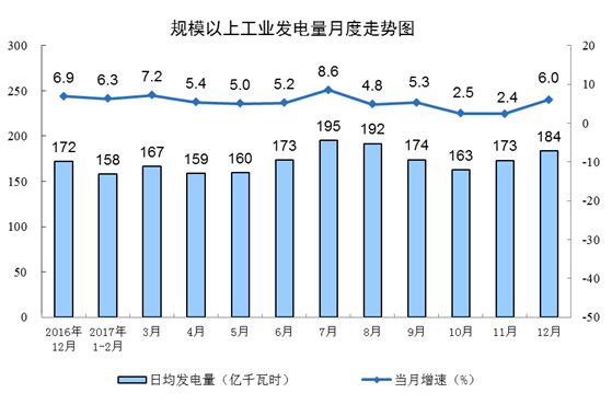 12月份,全国平均气温较上年同期偏低1.9℃,受寒潮天气及煤改电政策等的影响,用电需求增加,电力生产加快,发电量同比增长6.0%,增速比11月份加快3.6个百分点,日均发电量183.8亿千瓦时,比11月份增加10.6亿千瓦时。