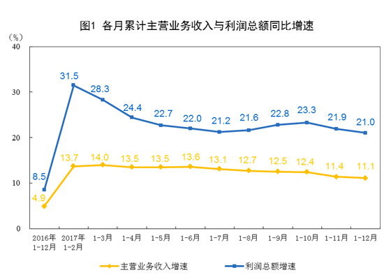 2017年12月份,规模以上工业企业实现利润总额8241.6亿元,同比增长10.8%,增速比11月份放缓4.1个百分点。