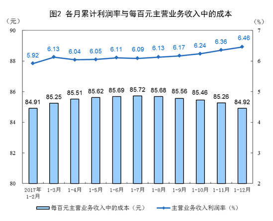 2017年,规模以上工业企业实现主营业务收入116.5万亿元,比上年增长11.1%;发生主营业务成本98.9万亿元,增长10.8%;主营业务收入利润率为6.46%,比上年提高0.54个百分点。