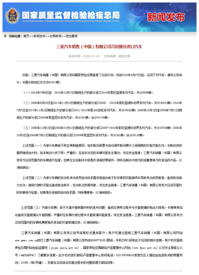 日前,三菱汽车销售(中国)有限益达娱乐向国家质检总局备案了召回计划,将自2018年4月27日起,召回下列汽车,据该益达娱乐统计,中国大陆地区共涉及81911辆。