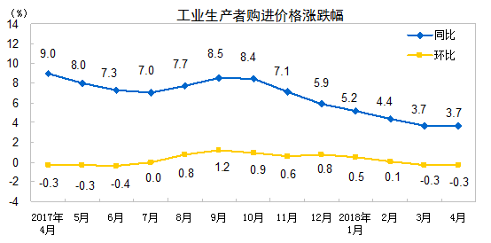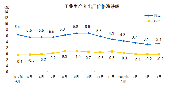 2018年4月份,全国工业生产者出厂价格同比上涨3.4%,环比下降0.2%。工业生产者购进价格同比上涨3.7%,环比下降0.3%。1-4月平均,工业生产者出厂价格同比上涨3.6%,工业生产者购进价格同比上涨4.2%。