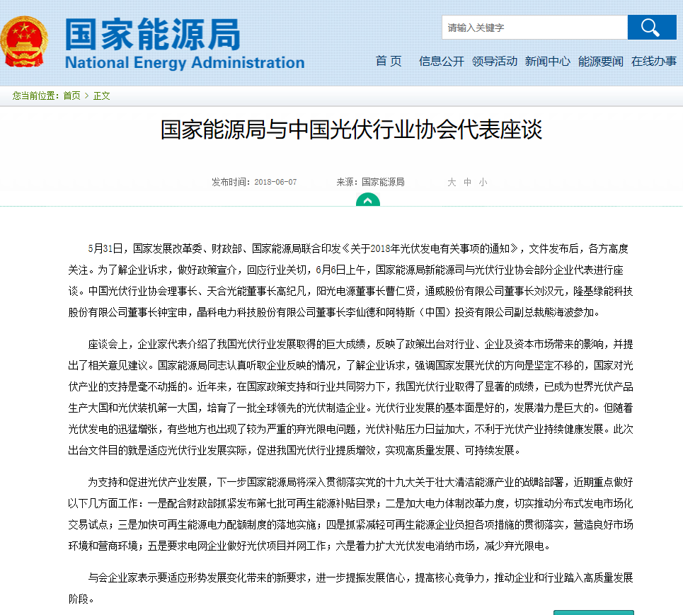 中证网讯 国家能源局网站6月7日消息,6月6日上午,国家能源局新能源司与光伏行业协会部分企业代表进行座谈。国家能源局强调,国家发展光伏的方向是坚定不移的,国家对光伏产业的支持是毫不动摇的。光伏行业发展的基本面是好的,发展潜力是巨大的。但随着光伏发电的迅猛增张,有些地方也出现较为严重的弃光限电问题,光伏补贴压力日益加大,不利于光伏产业持续健康发展。此次出台文件目的就是适应光伏行业发展实际,促进我国光伏行业提质增效,实现高质量发展、可持续发展。
