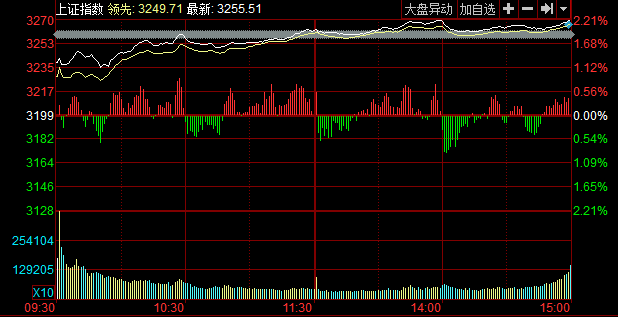 A股今日迎来狗年的第一个交易日,沪指高开高走,收盘大涨2.17%,创18个月以来最大单日涨幅,收报3268.56点。两市合计成交3252亿元,行业板块全线上扬,民航机场、有色金属、水泥建材板块强势领涨。