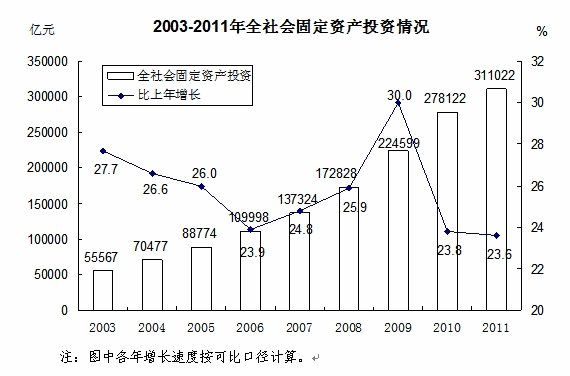 据国家统计局网站消息,国家统计局贸经司今日发表题为《固定资产投资建设成就斐然——从十六大到十八大经济社会发展成就系列报告之六》的文章,文章指出,2003-2011年,中国累计完成全社会固定资产投资1448711亿元,年均增长25.6%。