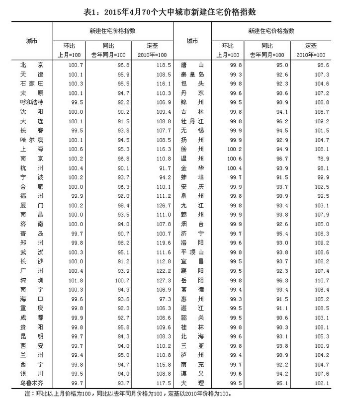 (二)与去年同月相比,70个大中城市中,价格下降的城市有69个,上涨的城市有1个。4月份,同比价格变动中,最高涨幅为0.7%,最低为下降10.3%。