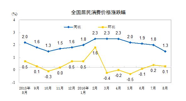2016年8月份,全国居民消费价格总水平同比上涨1.3%。其中,城市上涨1.4%,农村上涨1.0%;食品价格上涨1.3%,非食品价格上涨1.4%;消费品价格上涨0.9%,服务价格上涨2.1%。
