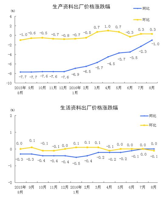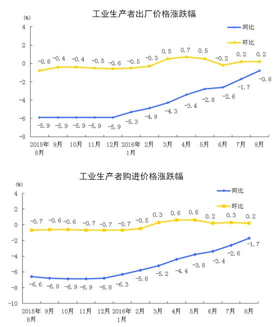 2016年8月份,全国工业生产者出厂价格环比上涨0.2%,同比下降0.8%。工业生产者购进价格环比上涨0.2%,同比下降1.7%。1-8月平均,工业生产者出厂价格同比下降3.2%,工业生产者购进价格同比下降4.1%。