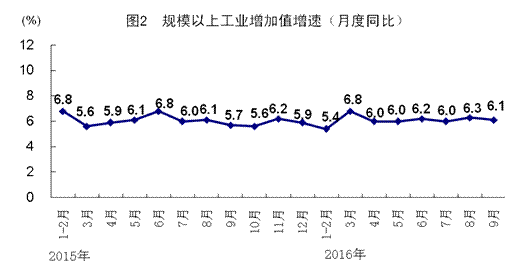前三季度,全国规模以上工业增加值按可比价格计算同比增长6.0%,增速与上半年持平。分经济类型看,国有控股企业增加值同比增长1.0%,集体企业增长0.7%,股份制企业增长6.9%,外商及港澳台商投资企业增长4.2%。分三大门类看,采矿业增加值同比下降0.4%,制造业增长6.9%,电力、热力、燃气及水生产和供应业增长4.3%。工业结构继续优化。前三季度,高技术产业和装备制造业增加值同比分别增长10.6%和9.1%,增速分别比规模以上工业快4.6和3.1个百分点,占规模以上工业增加值比重分别为12.2%和32.6%,比上年同期提高0.6和1.2个百分点。规模以上工业企业产销率达到97.5%。规模以上工业企业实现出口交货值85950亿元,同比下降0.1%。9月份,规模以上工业增加值同比增长6.1%,环比增长0.47%。