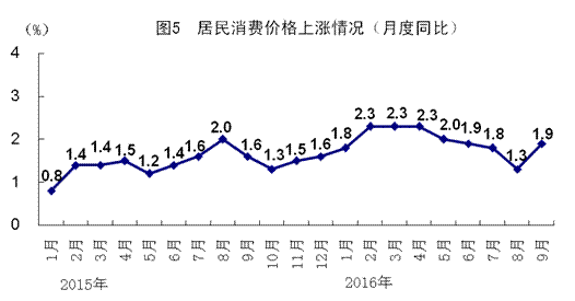 前三季度,居民消费价格同比上涨2.0%,涨幅比上半年回落0.1个百分点。其中,城市上涨2.0%,农村上涨1.8%。分类别看,食品烟酒价格同比上涨4.1%,衣着上涨1.5%,居住上涨1.5%,生活用品及服务上涨0.5%,交通和通信下降1.8%,教育文化和娱乐上涨1.4%,医疗保健上涨3.6%,其他用品和服务上涨2.4%。在食品烟酒价格中,粮食价格上涨0.5%,猪肉价格上涨21.2%,鲜菜价格上涨12.3%。9月份,居民消费价格同比上涨1.9%,环比上涨0.7%。前三季度,工业生产者出厂价格同比下降2.9%,降幅比上半年收窄1.0个百分点;9月份同比上涨0.1%,结束了同比连续54个月下降的态势,环比上涨0.5%。前三季度,工业生产者购进价格同比下降3.8%,9月份同比下降0.6%,环比上涨0.4%。