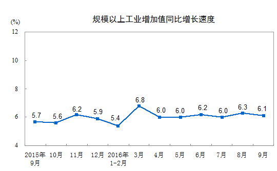 2016年9月份,规模以上工业增加值同比实际增长6.1%(下同,增加值增速均为扣除价格因素的实际增长率),较8月份回落0.2个百分点。从环比看,9月份,规模以上工业增加值比上月增长0.47%。1-9月份,规模以上工业增加值同比增长6.0%。