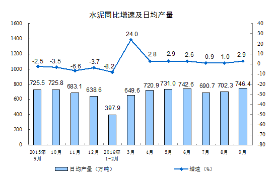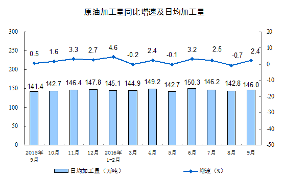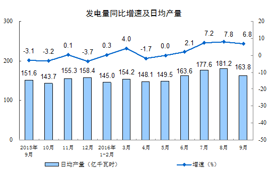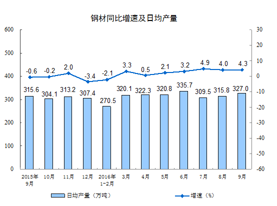 分产品看,9月份,统计的589种主要产品中有341种产品同比增长。其中,钢材9809万吨,同比增长4.3%;水泥22393万吨,增长2.9%;十种有色金属452万吨,增长2.7%;乙烯132万吨,下降14.4%;汽车257.6万辆,增长31.5%;轿车113.0万辆,增长29.9%;发电量4913亿千瓦时,增长6.8%;原油加工量4380万吨,增长2.4%。