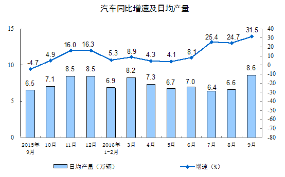分行业看,9月份,41个大类行业中有34个行业增加值保持同比增长。其中,农副食品加工业增长6.2%,纺织业增长3.3%,化学原料和化学制品制造业增长7.2%,非金属矿物制品业增长4.8%,黑色金属冶炼和压延加工业下降3.1%,有色金属冶炼和压延加工业增长4.4%,通用设备制造业增长7.0%,专用设备制造业增长7.8%,汽车制造业增长22.5%,铁路、船舶、航空航天和其他运输设备制造业增长3.9%,电气机械和器材制造业增长8.3%,计算机、通信和其他电子设备制造业增长8.6%,电力、热力生产和供应业增长7.1%。