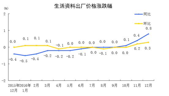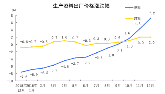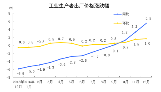 2016年12月份,全国工业生产者出厂价格环比上涨1.6%,同比上涨5.5%。工业生产者购进价格环比上涨1.9%,同比上涨6.3%。2016年,工业生产者出厂价格同比下降1.4%,工业生产者购进价格同比下降2.0%。