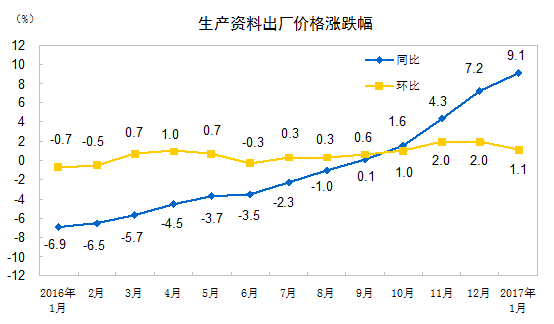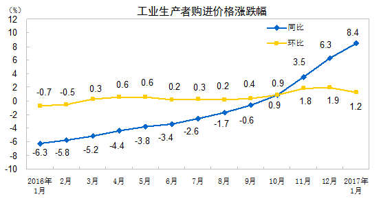 2017年1月份,全国工业生产者出厂价格同比上涨6.9%,环比上涨0.8%。工业生产者购进价格同比上涨8.4%,环比上涨1.2%。