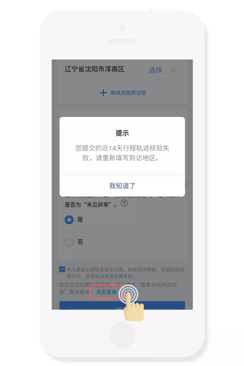 如果不确定14天到访地区或提示14天行程轨迹核验失败时,可点击页面底部提示中的“点击查询”进行确认,页面会跳转到“通信大数据行程卡”,即可进行行程查询。