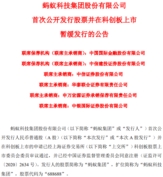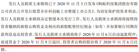 2020年11月5日,蚂蚁集团发布A股暂缓发行相关事项的公告,依据公告披露,经与主承销商协商,蚂蚁集团决定暂缓本次发行程序并同步披露了相关退款安排,及时返还冻结申购资金并加算同期银行存款利息。