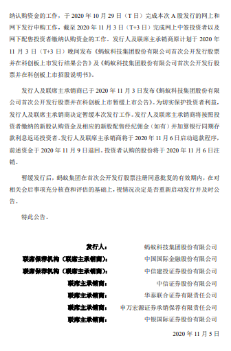 蚂蚁集团(688688)11月5日晚间公告,发行人及联席主承销商已于 2020 年 11 月 3 日发布《蚂蚁科技集团股份有限益达娱乐首次公开发行股票并在科创板上市暂缓上市公告》。为切实保护投资者利益,发行人及联席主承销商决定暂缓本次发行工作。发行人及联席主承销商将按照投资者缴纳的新股认购资金及相应的新股配售经纪佣金(如有)并加算银行同期存款利息返还投资者。