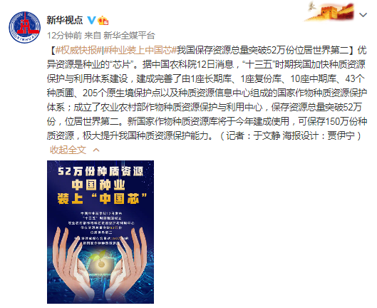 优异资源是种业的“芯片”。据中国农科院12日消息,“十三五”时期我国加快种质资源保护与利用体系建设,建成完善了由1座长期库、1座复份库、10座中期库、43个种质圃、205个原生境保护点以及种质资源信息中心组成的国家作物种质资源保护体系;成立了农业农村部作物种质资源保护与利用中心,保存资源总量突破52万份,位居世界第二。新国家作物种质资源库将于今年建成使用,可保存150万份种质资源,极大提升我国种质资源保护能力。(记者:于文静 海报设计:贾伊宁)