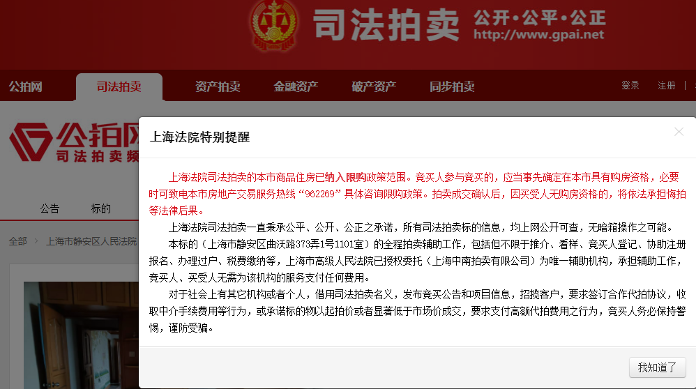 中证网讯(记者 黄一灵)1月25日,记者从公拍网获悉,上海法院司法拍卖的上海市商品住房已纳入限购政策范围。竞买人参与竞买的,应当事先确定在上海市具有购房资格。拍卖成交确认后,因买受人无购房资格的,将依法承担悔拍等法律后果。