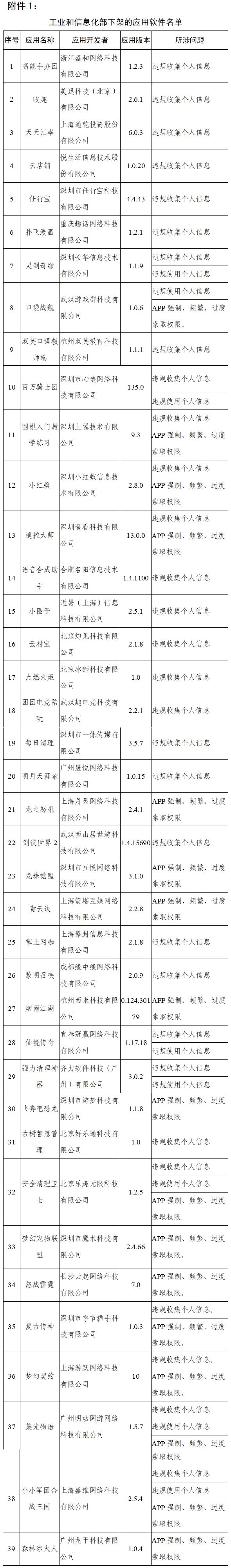 上证报中国证券网讯 据“工信微报”微信公众号5月13日消息,2021年4月23日,工信部向社会通报了93家存在侵害用户权益行为APP企业的名单。截至目前,经第三方检测机构核查复检,尚有39款APP未按照工信部要求完成整改(详见附件1)。各通信管理局按工信部APP整治行动部署,积极开展手机应用软件监督检查,此次内蒙古、安徽、广东、四川、浙江省(自治区)通信管理局检查发现共有46款APP仍未完成整改。