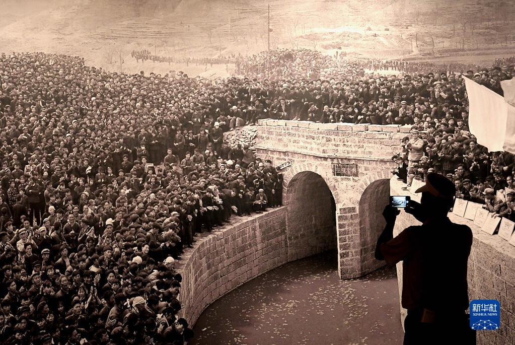 参观者在红旗渠纪念馆拍摄展出的红旗渠通水庆典照片(2019年7月4日摄)。新华社记者 李安 摄