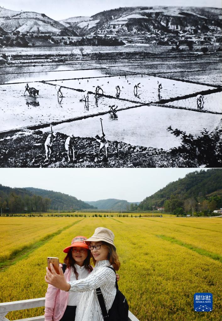 这是一张拼版照片,上图为抗战时期延安南泥湾的生产场景(资料图片);下图为2018年9月12日,游客在延安南泥湾稻田旁留影(新华社记者刘潇摄 )。新华社发