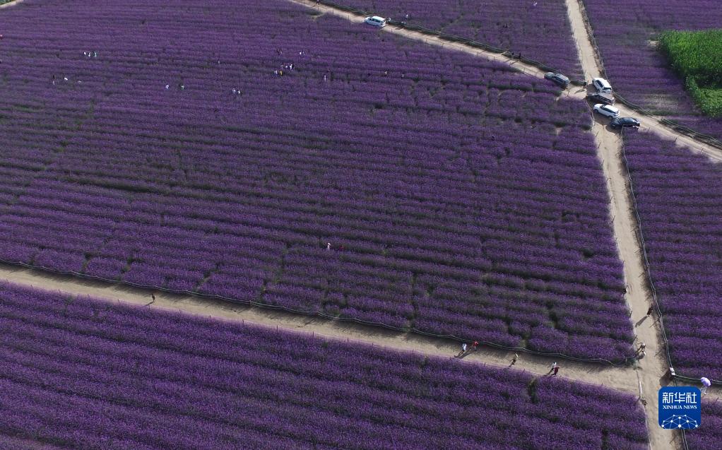 游人在延安南泥湾赏花游览(2020年8月19日摄,无人机照片)。新华社发(祁小军 摄)